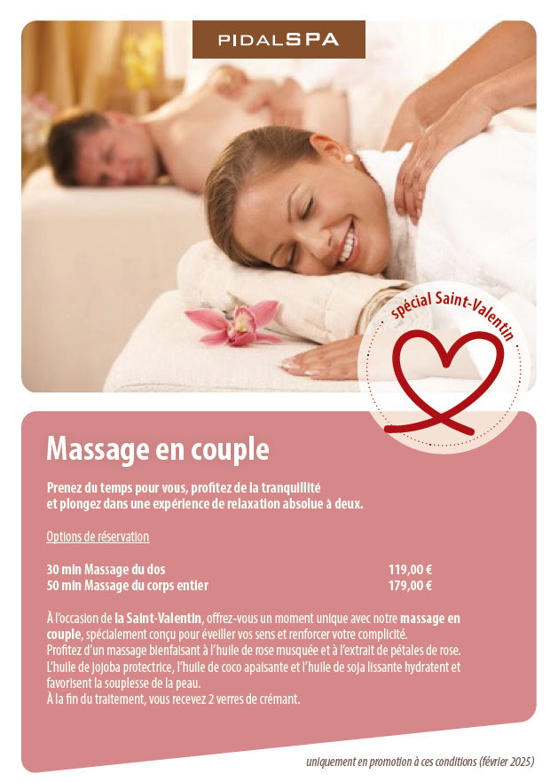 Le massage en duo proposé par PIDALspa pour la Saint-Valentin s’inscrit précisément dans cette logique. L’huile de rose musquée parfume l’air, les gestes glissent, la chaleur s’installe. On écoute sa propre respiration, puis celle de l’autre. On ne parle pas, mais on se retrouve à travers la peau, le rythme, le souffle.